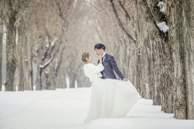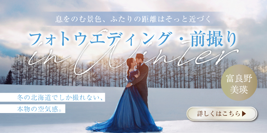 北海道には、広大なラベンダー畑やひまわり畑、壮大な山々、澄んだ湖など、どこを切り取っても絵になるフォトジェニックなスポットが凝縮されています。 夏の撮影は鮮やかで開放的な雰囲気、秋の紅葉や落ち葉が敷き詰められた森での撮影は温かみのあるシックな雰囲気、そして冬の雪景色では幻想的でロマンチックな世界観を演出できます。 どの季節でも、それぞれの美しさが引き立つ北海道ならではのフォトウェディングが叶います。 一生に一度の特別な撮影を、息をのむほど美しい風景の中で楽しんでみませんか? ※プラン料金:札幌、函館での撮影の場合