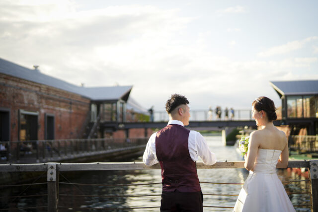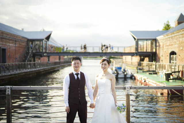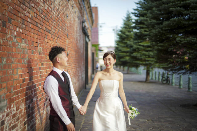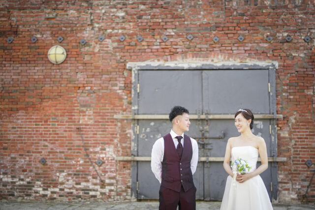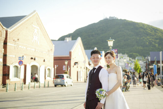 異国情緒ただよう函館ベイエリア。石畳の道、煉瓦の壁、港に停まる船…どこを切り取ってもフォトジェニックな風景が、ふたりの自然な笑顔とぴったり重なります。洋装はもちろん、モダンな和装スタイルとも相性抜群。