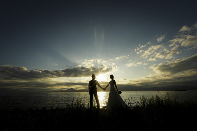 車で少し移動した先にある、知る人ぞ知る静かな海岸「穴間海岸」。波の音だけが響く浜辺で、空が黄金色から深い藍色へと変わっていく時間。秋の夕暮れは少し切なくて、でもどこまでもあたたかい。そんな空気感の中で撮るふたりのシルエットは、きっと一生の宝物に。日が落ちてからは、再び函館の街へ。ライトアップされた八幡坂や赤レンガ倉庫の灯りが、ふたりを幻想的に照らします。