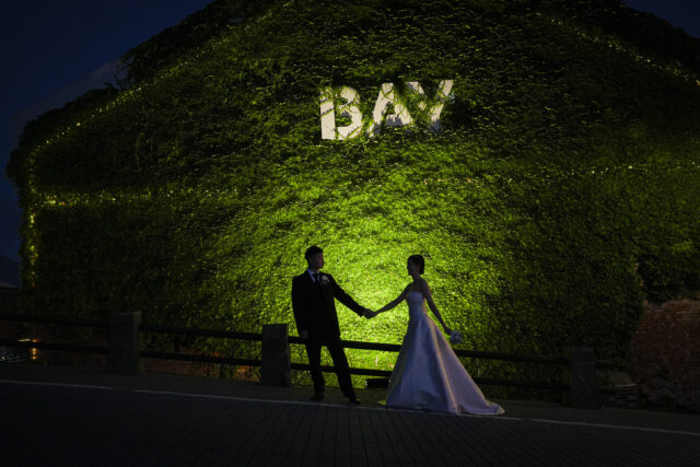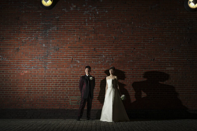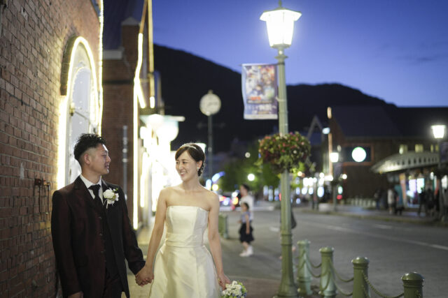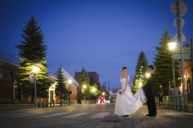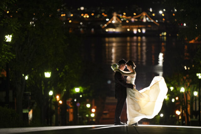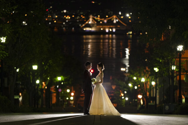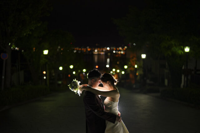 静かな夜の街に、ドレスの白さとふたりの距離感がより一層際立ち、日中とは全く違うドラマチックな表情を見せてくれます。