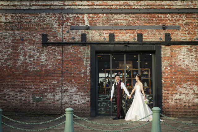 異国情緒ただよう函館ベイエリア。石畳の道、煉瓦の壁、港に停まる船…どこを切り取ってもフォトジェニックな風景が、ふたりの自然な笑顔とぴったり重なります。洋装はもちろん、モダンな和装スタイルとも相性抜群。