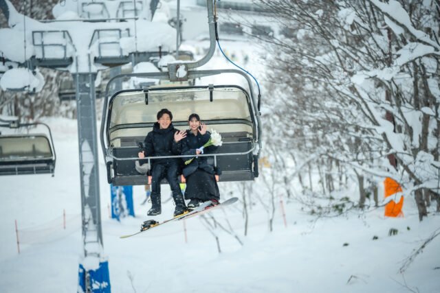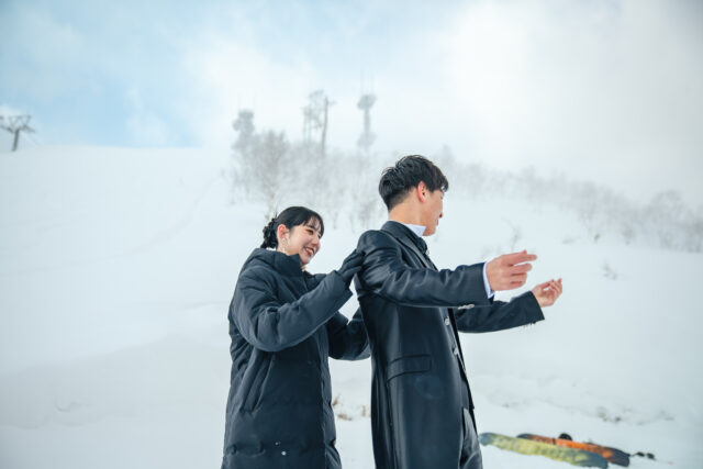 ゲレンデでボードを担いだり、雪の上で笑い合ったり。自然体で楽しむ姿こそ、ふたりの絆が一番輝く瞬間。まるで雑誌の1ページのような写真が撮れます。