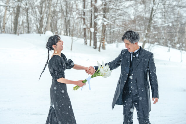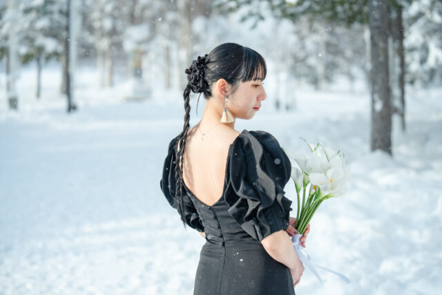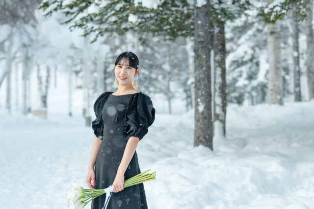 ふわふわの雪が光を反射して、まるで自然のレフ板のよう。白いドレスも、ウェア姿も、どちらも美しく映える最高のロケーションです。