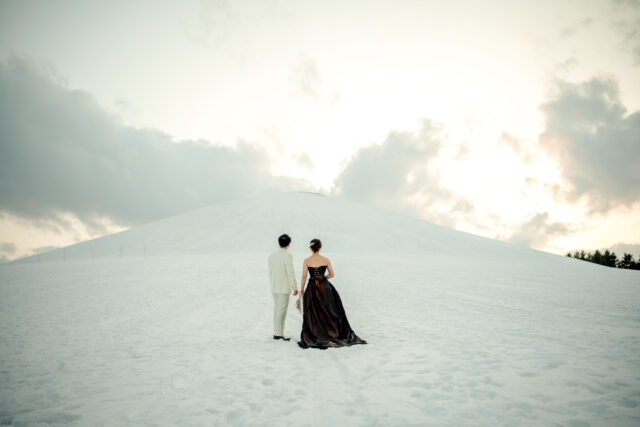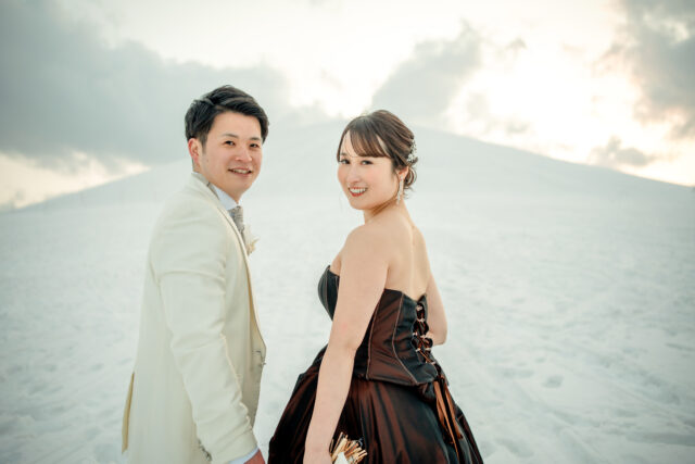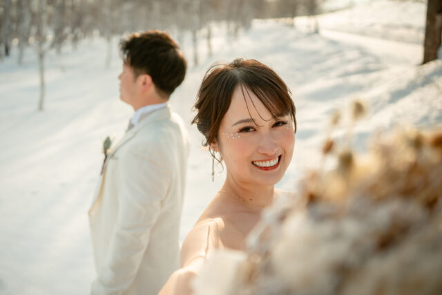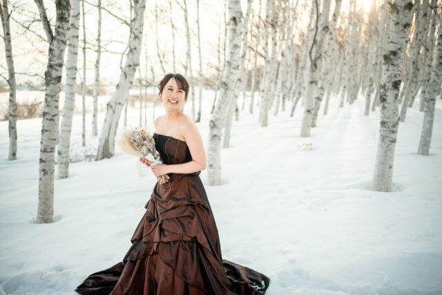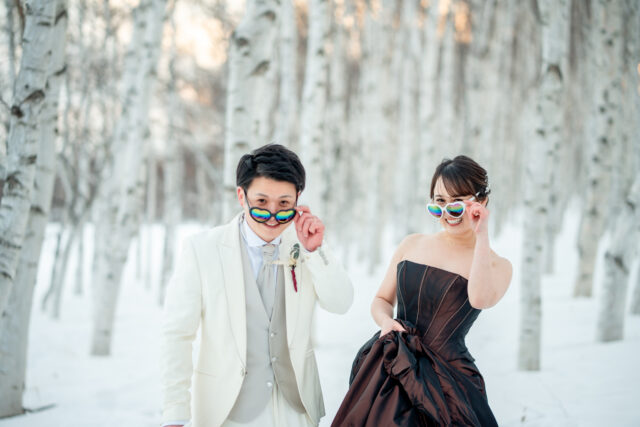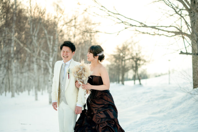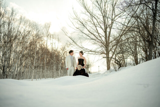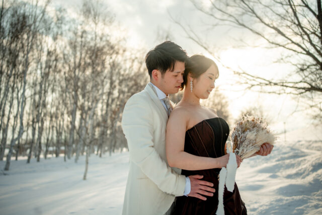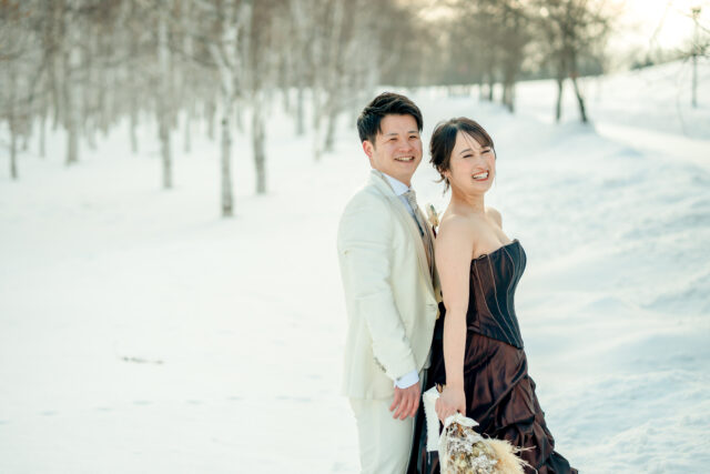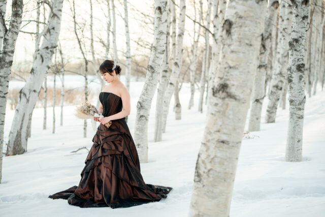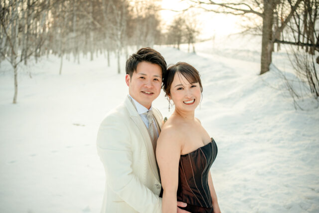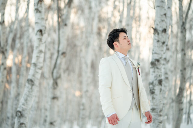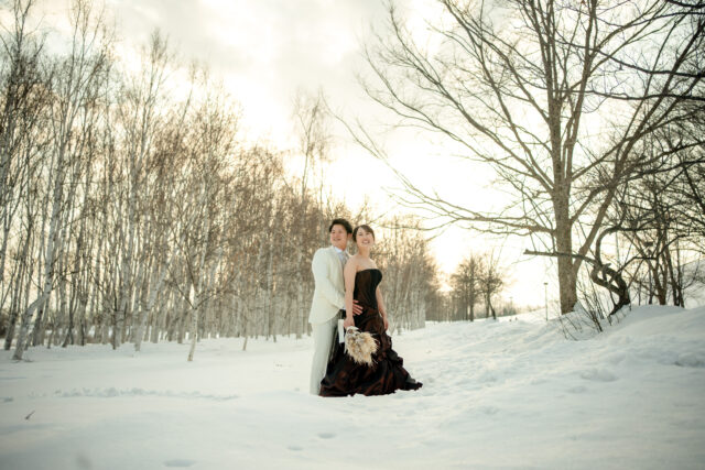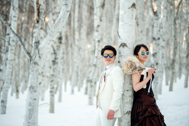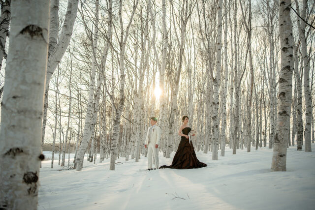 白樺の幹、足元の雪、淡い冬の光。背景が静かだからこそ、洋装のシルエットや質感、ふたりの距離感が際立ちます。派手さではなく、