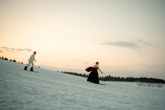 面の雪原、遠くまで続く空。冬のモエレ沼公園は、余計なものをすべて削ぎ落とした舞台。そこをスノーボードで滑る姿は、ポーズではなく、生きた一瞬。転びそうになって笑う顔も、スピードに乗った背中も、全部が「ふたりの物語」になる。