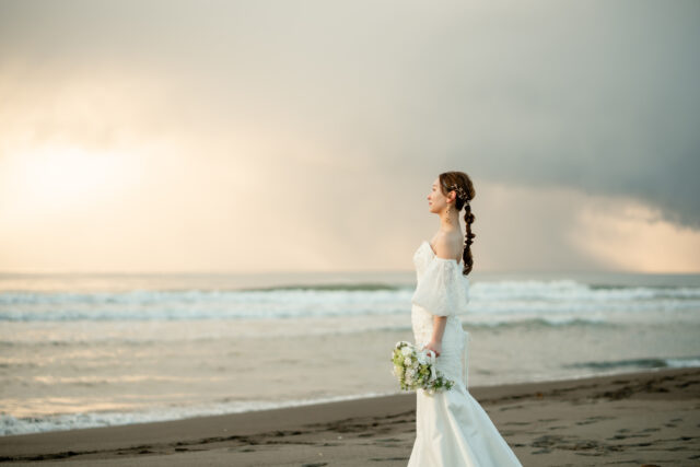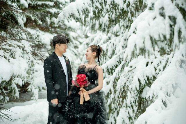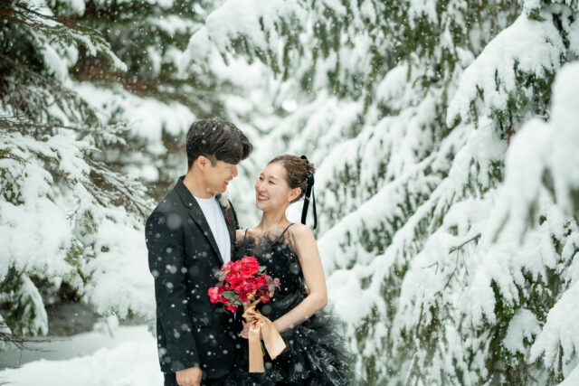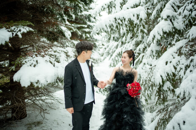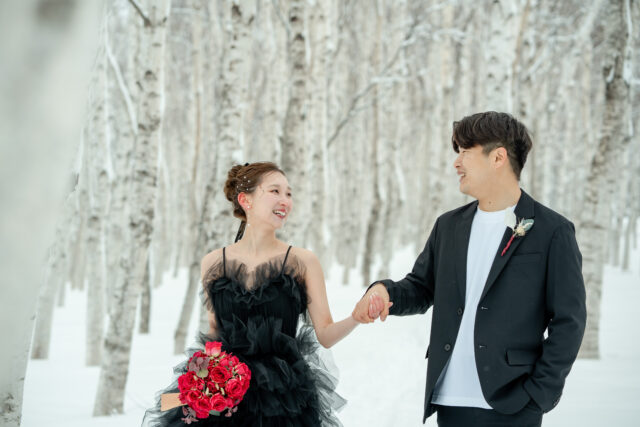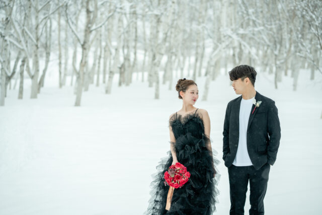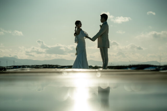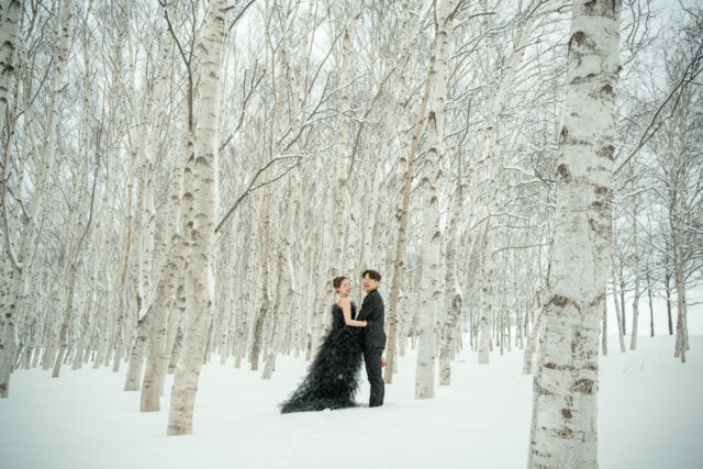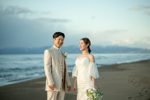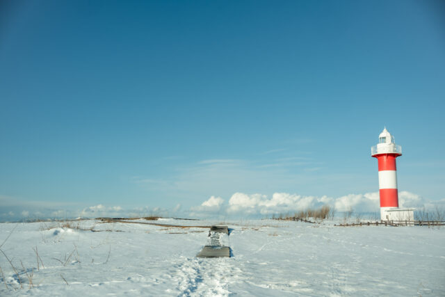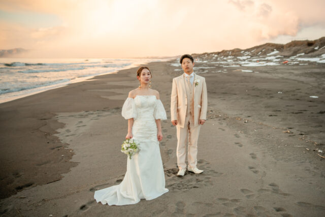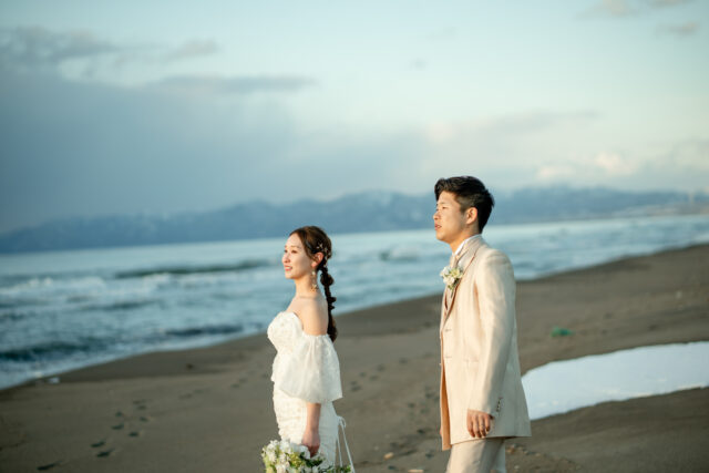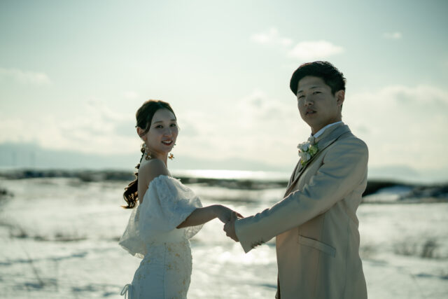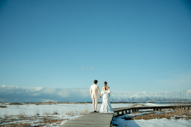 石狩はまなすの丘公園と、その先に広がる浜は、北海道らしい“静けさの美”が完成する季節を迎えます。雪はまだ大地に残り、海は低く、空は広い。色を抑えた風景だからこそ、ふたりの存在が、まっすぐに浮かび上がります。
