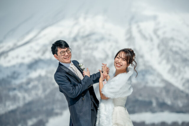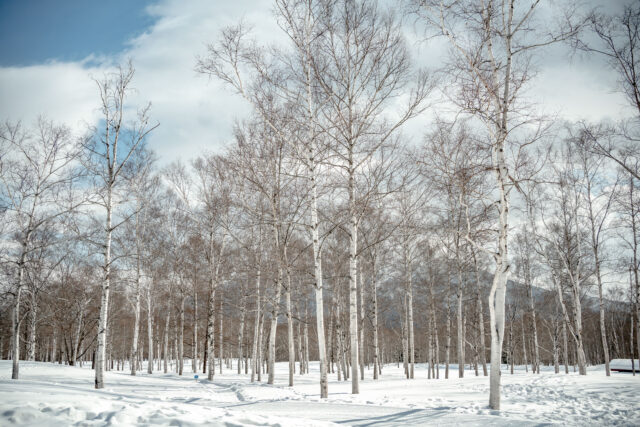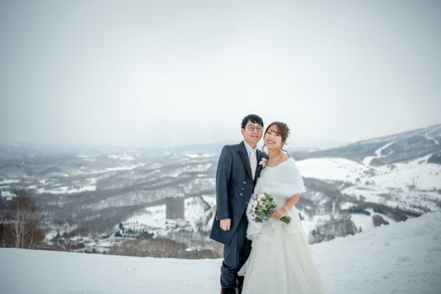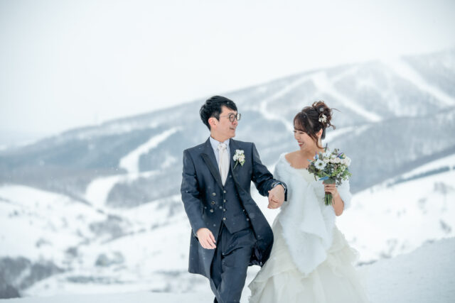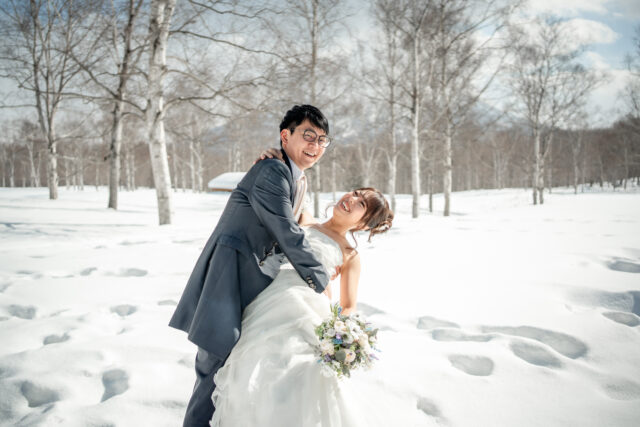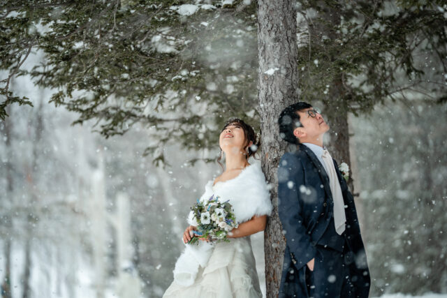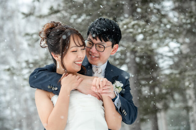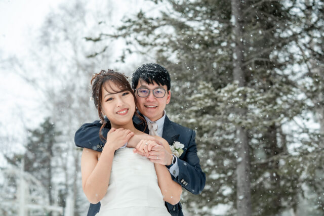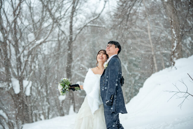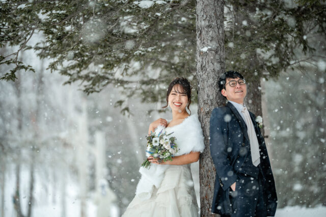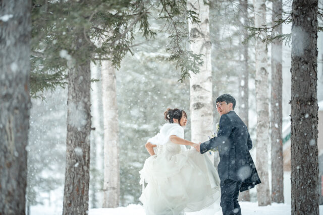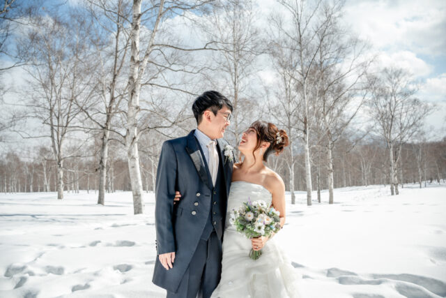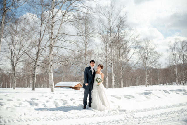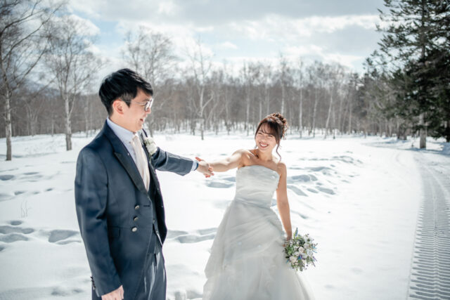 白だけの世界に、まっすぐ伸びる白樺。その凛とした佇まいが、ふたりの姿勢や覚悟まで写し出します。北海道・ルスツリゾートの冬、白樺並木は余計なものをすべて削ぎ落とした完成された背景になります。