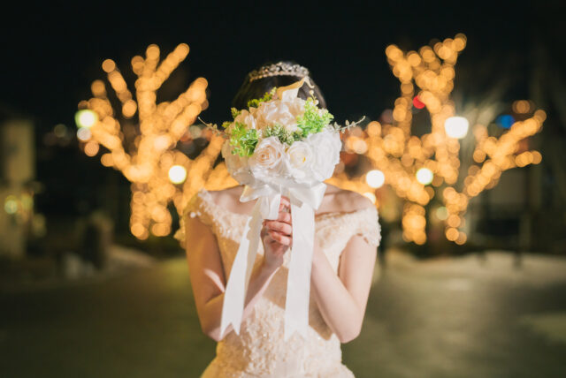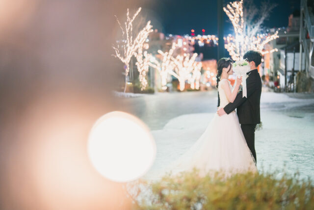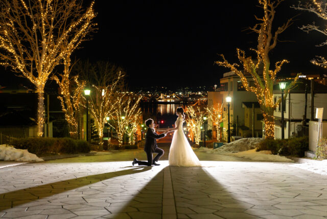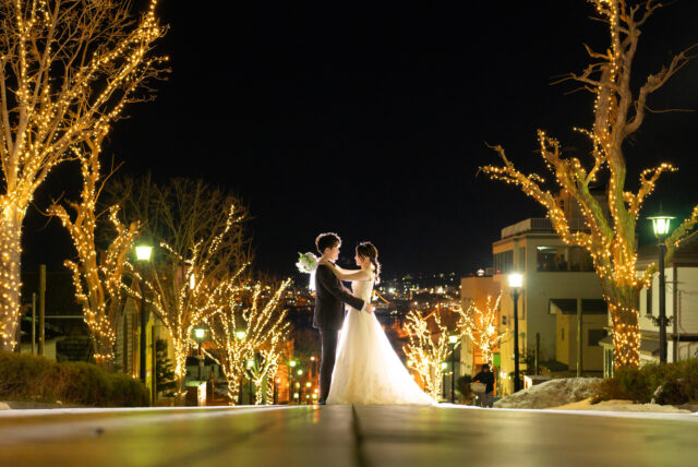 まるで映画のワンシーンのよう。イルミネーションが輝く八幡坂は、特別なフォトウエディングを叶える場所です。