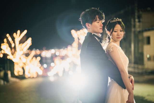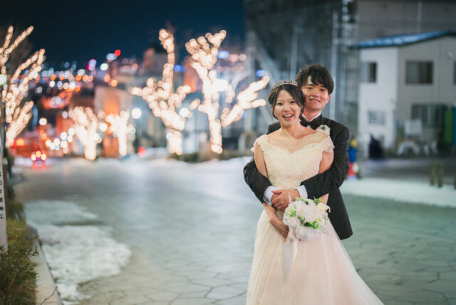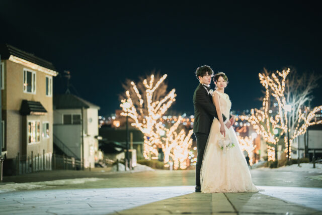 函館を代表する絶景スポット、八幡坂。昼間の美しさも魅力ですが、夜になるとイルミネーションの光に包まれ、街全体がロマンチックな雰囲気に変わります。坂の先に広がる函館の港、やさしく輝く街灯、光のラインが続く石畳の道。その景色の中に立つふたりは、