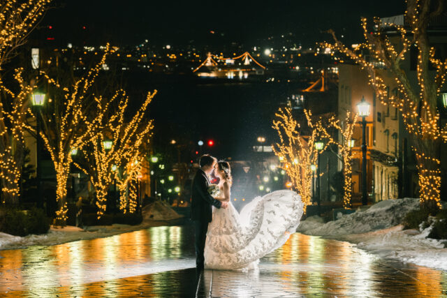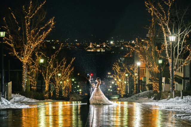 まるで映画のワンシーンのよう。イルミネーションが輝く八幡坂は、特別なフォトウエディングを叶える場所です。