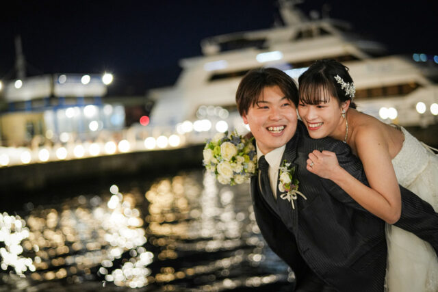 函館を代表する絶景スポット、八幡坂。昼間の美しさも魅力ですが、夜になるとイルミネーションの光に包まれ、街全体がロマンチックな雰囲気に変わります。坂の先に広がる函館の港、やさしく輝く街灯、光のラインが続く石畳の道。その景色の中に立つふたりは、