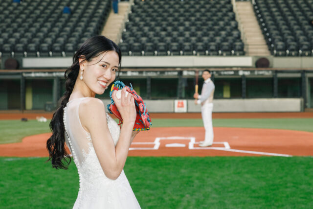 野球好きにはたまらないおふたりだけの球場撮影。普段は入ることができないフィールドでの特別な空間で撮影が叶います。